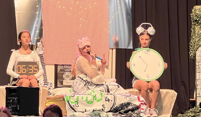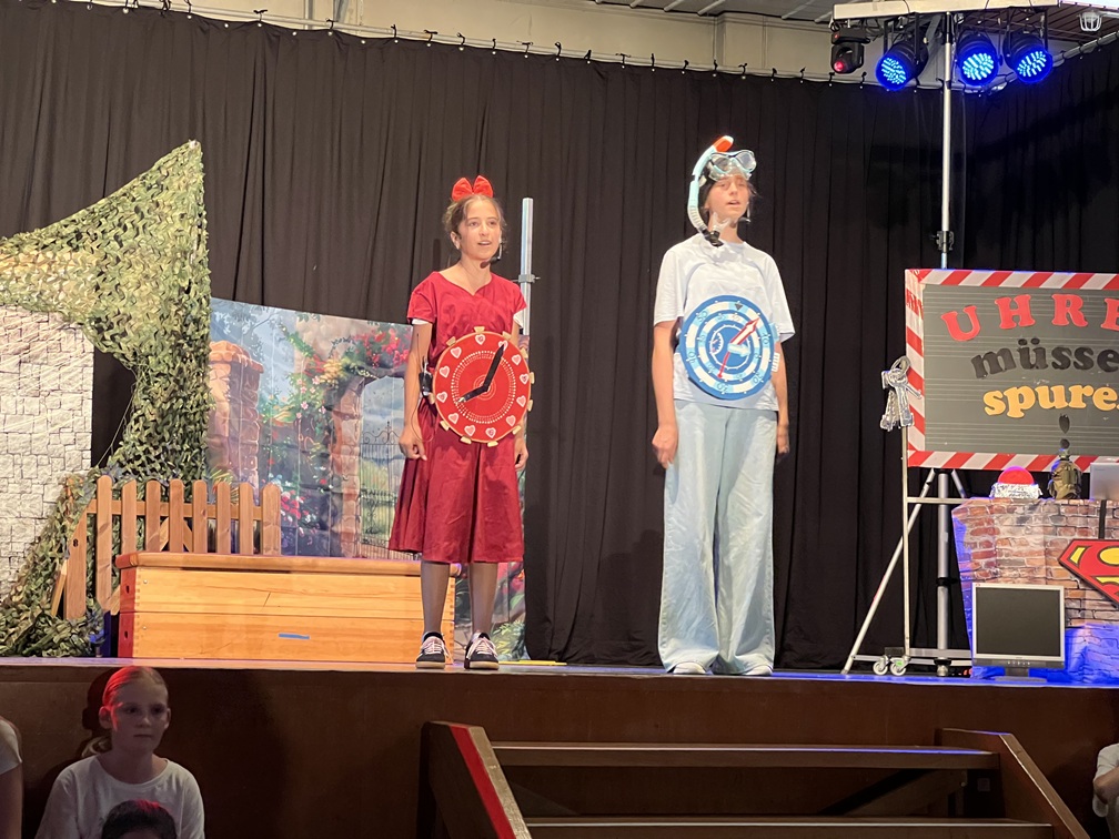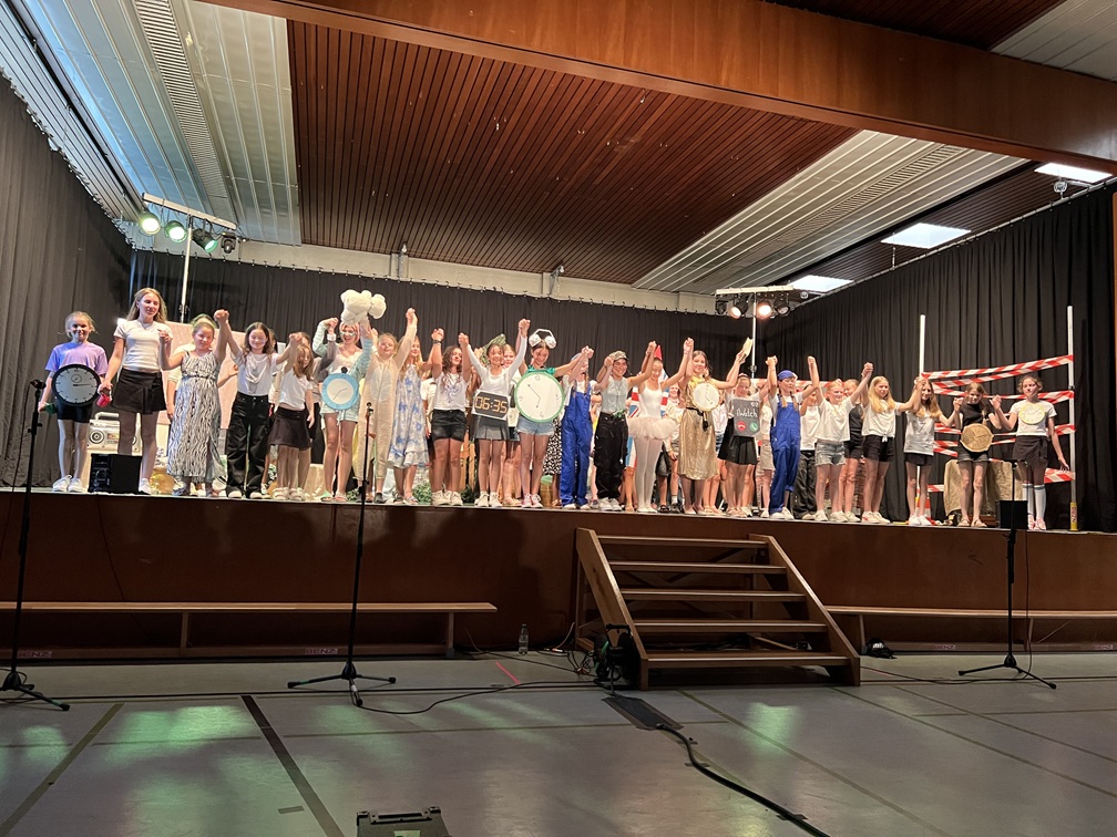 Das Musical „Ausgetickt – Die Stunde der Uhren“ wurde am 25.06. von 62 Schülerinnen und Schüler des Unterstufen-Chores auf der großen JKG-Bühne aufgeführt. Das Publikum wurde mit einer faszinierenden Geschichte, beeindruckender Darstellungsleistung und einwandfreier Licht- und Tontechnik begeistert. Die Geschichte entführte die Zuschauer in eine Welt verschiedener Uhren, welche pausenlos auf und ab marschieren, angetrieben von der Superuhr und ihren Gehilfen. Aber allmählich rumort es im Uhrenland und nach und nach scheren auch die anderen Uhren aus.