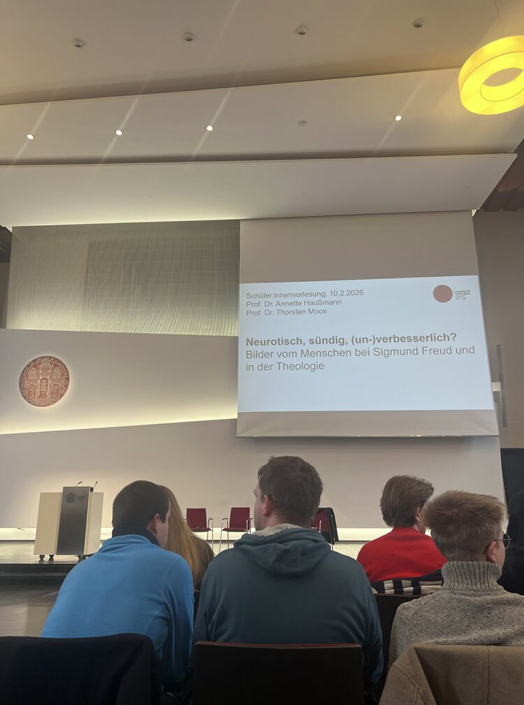 Am vergangenen Dienstag konnte der Religion Leistungskurs von Frau Crome „Unifeeling“ erleben: Passend zum Unterricht besuchte der Kurs die von der theologischen Fakultät der Universität Heidelberg angebotene SchülerInnen-Vorlesung „Neurotisch, sündig, (un-)verbesserlich? Bilder vom Menschen bei Sigmund Freud und in der Theologie“. Die Dozenten der Veranstaltung, Prof. Dr. Annette Haußmann und Prof. Dr. Thorsten Moos freuten sich über die Teilnahme von Rund 350 Schülerinnen und Schülern von unterschiedlichen Gymnasien und kombinierten Gedanken von Martin Luther und Sigmund Freud in einer Mischung aus Vorträgen und interaktiver Podiumsdiskussion. So konnte ein „Gespräch“ mit Luther und Freud mit den Schülerinnen und Schülern als „jungen Doctores“ entstehen, bei dem Fragen aufgeworfen und diskutiert wurden, die nicht nur den Theologen und den Psychoanalytiker in vergangenen Zeiten umtrieben, sondern auch heute für uns noch brandaktuell sind: Wie frei ist der Mensch? Haben wir einen freien Willen? Wer bestimmt, was wir wollen? Inwiefern sind wir in unserem eigenen Alltag frei oder unfrei?