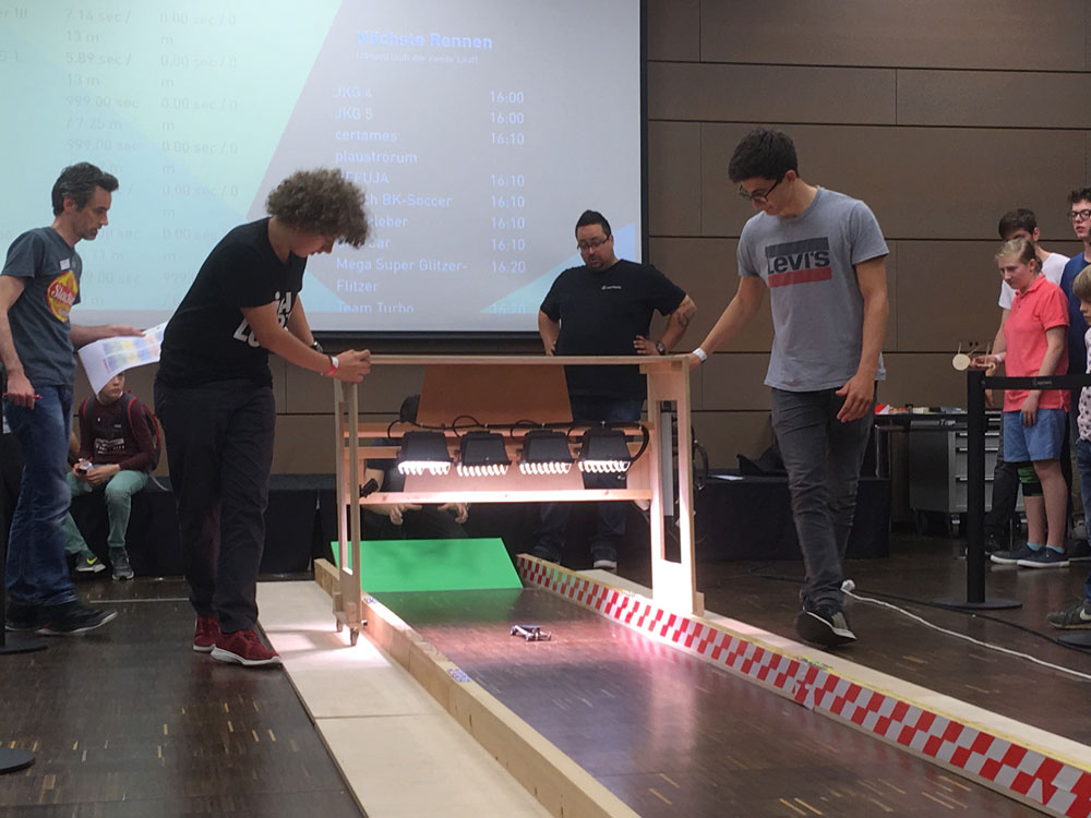 Am Samstag, den 25.05.19, fand in der Experimenta ein besonderer Wettbewerb statt. Ziel war es, mit einem selbstgebauten Auto eine 12 Meter lange Rennstrecke auf Parkett zu bewältigen. Jedoch gab es viele Vorgaben, die beachtet werden mussten: Das Auto sollte in einen Würfel mit vierzig Zentimeter Kantenlänge passen, wir durften als Antrieb nur den vorgegebenen Elektromotor verwenden und als Energiequelle war eine bestimmte Solarzelle vorgegeben. Diese Bauteile hatten wir einige Wochen zuvor durch unsere Physiklehrer erhalten. Um den Bau der Fahrzeuge haben wir uns selbstverständlich in unserer Freizeit gekümmert. Unsere Idee war es beispielsweise, den Körper aus Styropor zu bauen, um Gewicht zu sparen. Als Räder haben wir CDs verwendet, da diese eine geeignete Größe hatten und auch nicht allzu schwer waren. Insgesamt kamen wir so auf nur 160 Gramm. Dazu muss aber gesagt sein, dass einige Teams zwar dieselben Ansätze hatten, jedes einzelne jedoch am Ende ein ganz eigenes Konzept verfolgt hat.