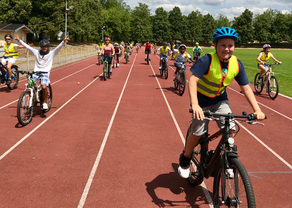 Bei optimalem Wetter machten wir uns gleich zur ersten Stunde auf den Weg. Von der Schule aus ging es diszipliniert über Zebrastreifen und Fußgängerampel hinunter zum Neckar. Den wunderschönen Radweg direkt am Wasser hatten wir fast für uns allein. Eine gute Stunde später erreichten wir dem Spielplatz in Lauffen und die ersten knapp 400 km waren geschafft. Nach einer Vesper- und Spielepause ging es wieder zurück auf den nächsten Spielplatz im Wertwiesenpark und schon hatten wir gut 800 km auf dem Konto. Der wichtigste Halt war die Eisdiele, wo sich die Kinder auf Rechnung der Klassenkasse ein Eis holen durften. Wieder in der Schule angekommen, zeigte der Tacho wie geplant 950 km. Dann war klar: die letzten Kilometer fahren wir gemeinsam auf unserer Rundbahn. Wir haben es geschafft: Jedes Kind der Klasse 5b fuhr heute 33 km, zusammen über 1000 km – der Jubel über diese starke Leistung war entsprechend groß.