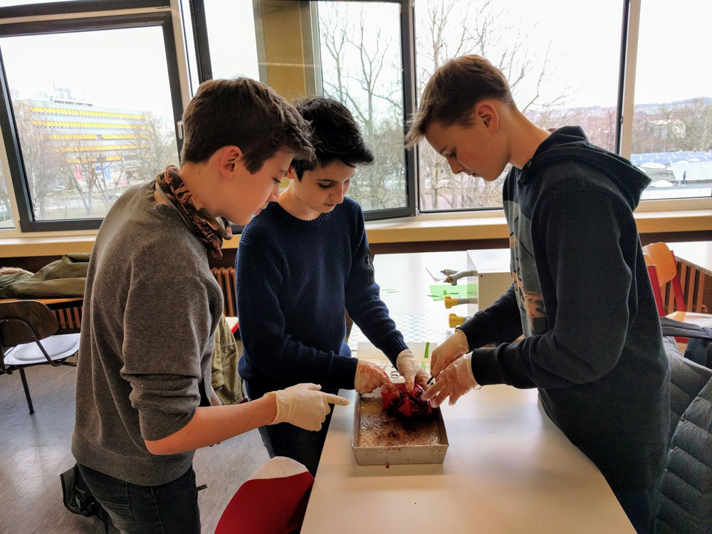 Im Rahmen des Biologieunterrichtes präparierte die Klasse 7c von Frau Schulze-Nicolai Schweineherzen. Im Aufbau und in der Größe ist ein Schweineherz dem menschlichen Herzen sehr ähnlich. Zunächst wurde das Herz von außen betrachtet und die einzelnen Strukturen wurden benannt. Im Anschluss wurde das Herz geöffnet und die Herzkammern, Vorhöfe und Klappen wurden untersucht. Anhand der Präparation wurde der Aufbau und die Funktion des Herzens anschaulich erlernt.