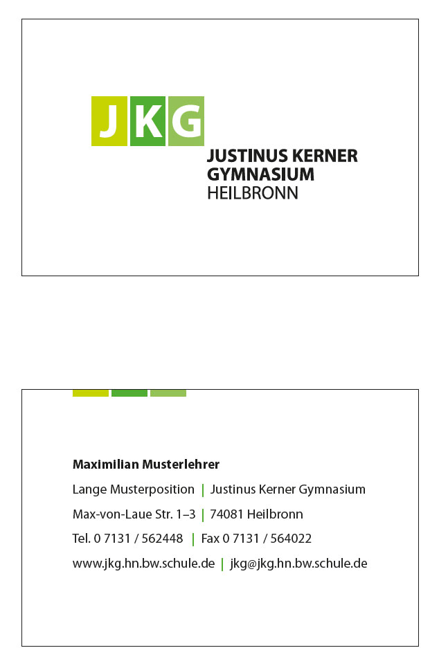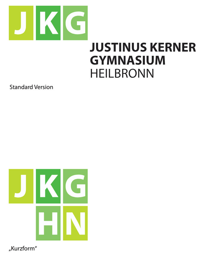 Das Standard Logo des Justinus-Kerner-Gymnasiums verbindet grafische und typografische Elemente in einem. Die Positionierung der Elemente erfolgt nach der natürlichen Leserichtung von links oben nach rechts unten. Hierdurch entsteht eine dynamische und moderne Anordnung mit einer hohen Eigenständigkeit und Wiedererkennung.