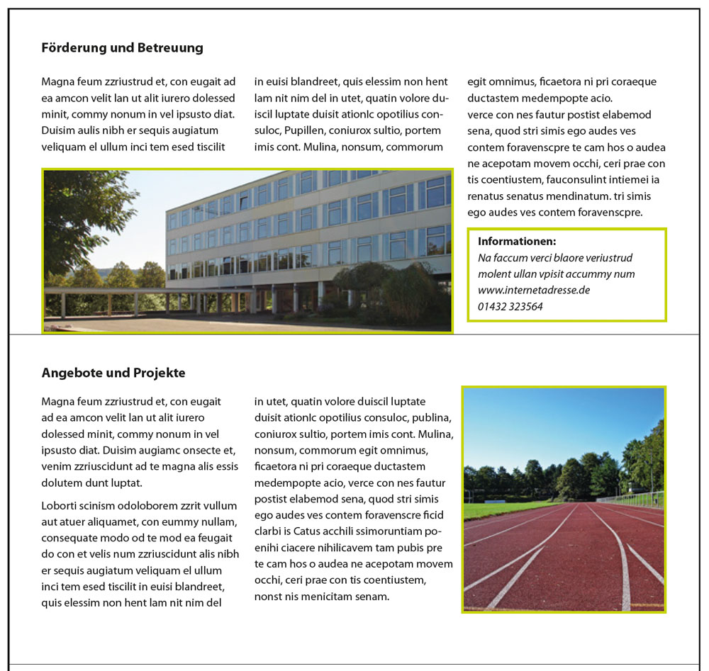 Freistehende Bilder werden mit einem Grünton umrahmt. Fließtext wird mehrspaltig (optimal dreispaltig) gesetzt.