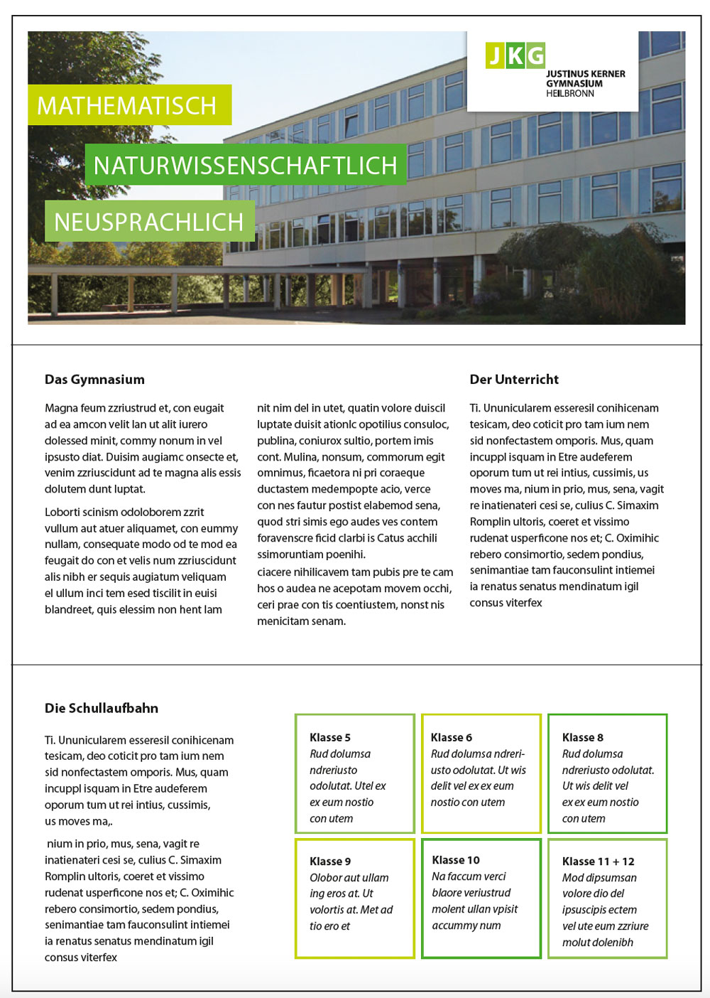 Die Farben nehmen direkten Bezug zum Claim „Das Gymnasium im Grünen“ und sorgen für eine freundliche und frische Anmutung im Erscheinungsbild.