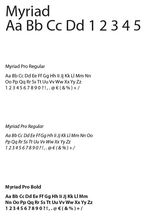 Die Schriftart Myriad wird im Logo und für die allgemeine schriftliche Kommunikation verwendet. Durch die feinen Strichstärkenunterschiede und den überstehenden Rundungen (z. B. bei den Buchstaben B, D, P, R) bekommt die Schrift einen sehr lebendigen Charakter.