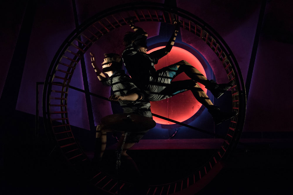Der Bühnenaufbau bestand aus einem großen Hamsterrad, das als Atticus‘ Zimmer, als Bett, als Fahrrad und als Bühne der Schule diente und gleich zu Beginn sogar als Bauch der Mutter, in dem die Zwillinge strampeln und aus dem sie geboren werden.