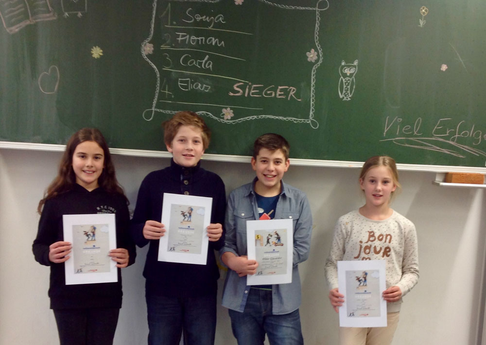 Am Montag, dem 4. Dezember fand die Schulentscheidung des diesjährigen Vorlesewettbewerbs statt. Die Klassensieger Sonja Esch, 6a, Florian Blind, 6b, Elias Schneider, 6c, sowie Carla Koehler, 6d, zeigten ihr Können. Am Ende hatte Elias die Nase vorn. Wir gratulieren und wünschen ihm viel Glück in der nächsten Runde, die Anfang Februar in der Heilbronner Stadtbibliothek durchgeführt wird.